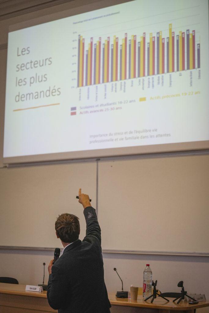 La matinée a été consacrée à des ateliers de réflexion autour du rapport de l’Institut Montaigne « Les jeunes et le travail : aspirations et désillusions des 16-30 ans ». Répartis en groupes mixtes, les étudiants issus des différentes grandes Écoles ont travaillé ensemble sur les attentes des jeunes générations vis-à-vis du monde professionnel.